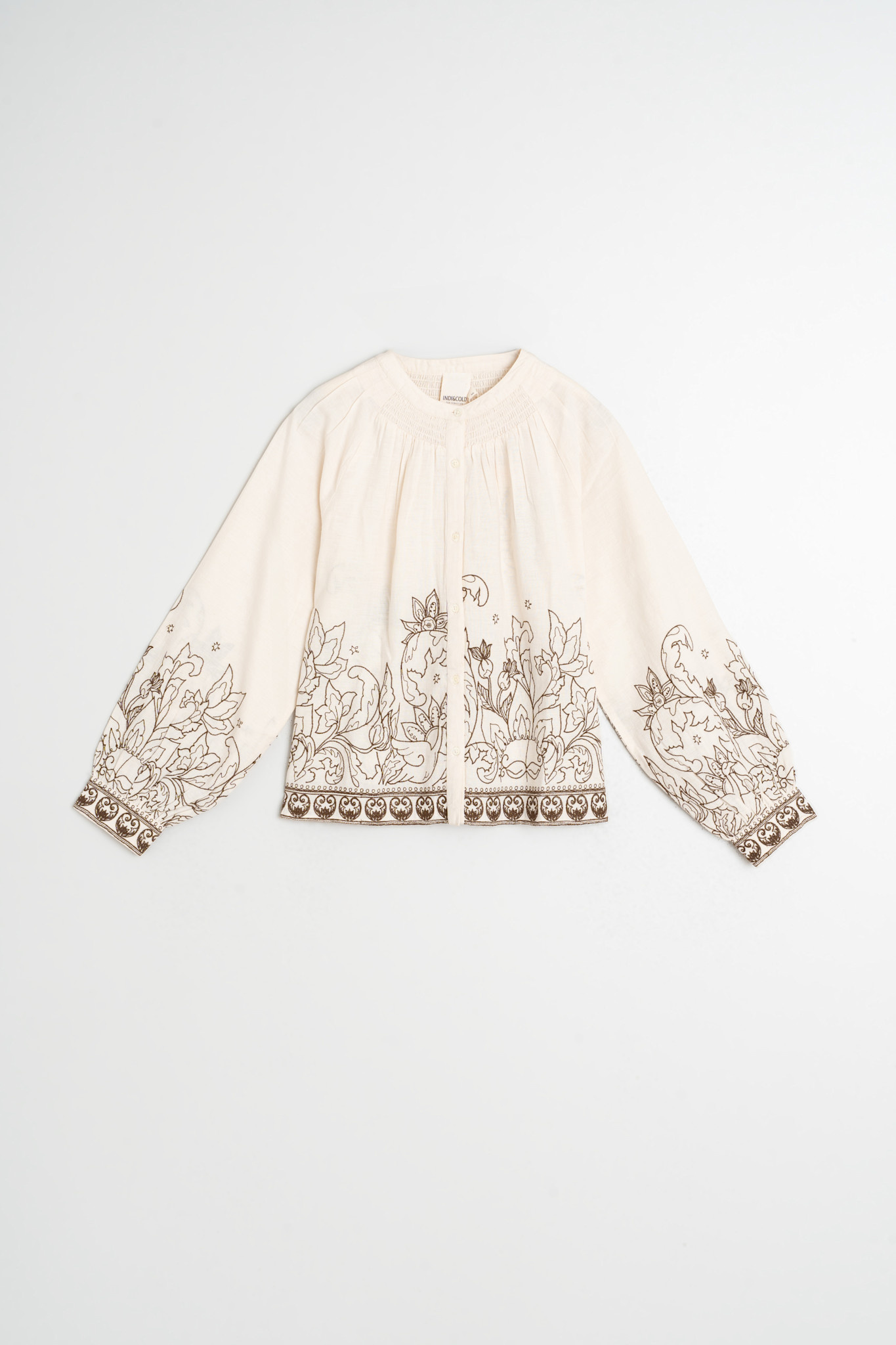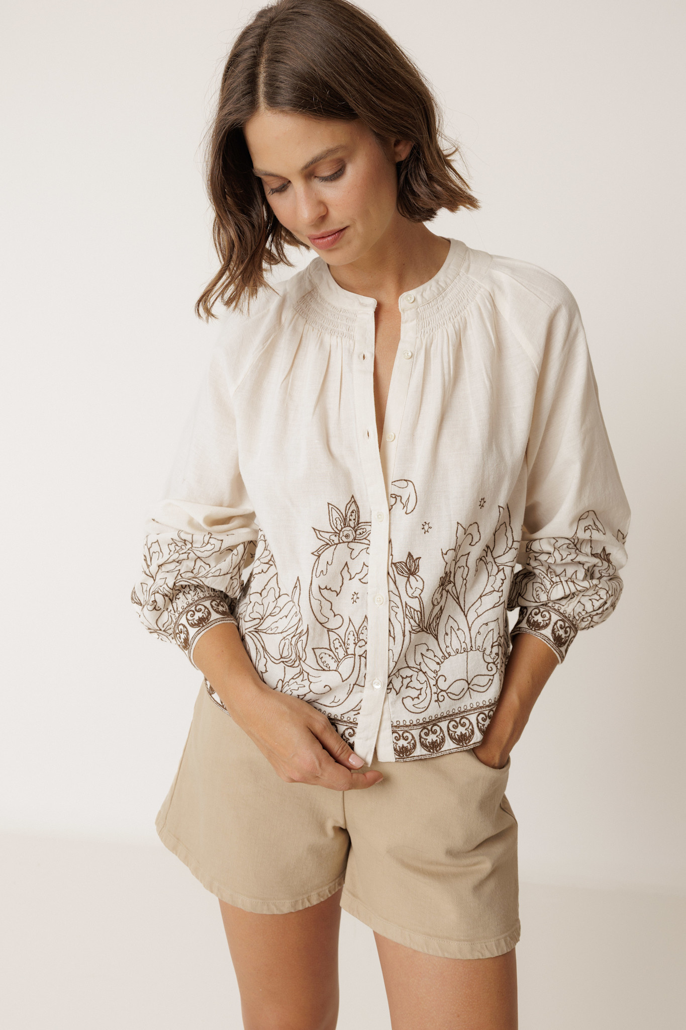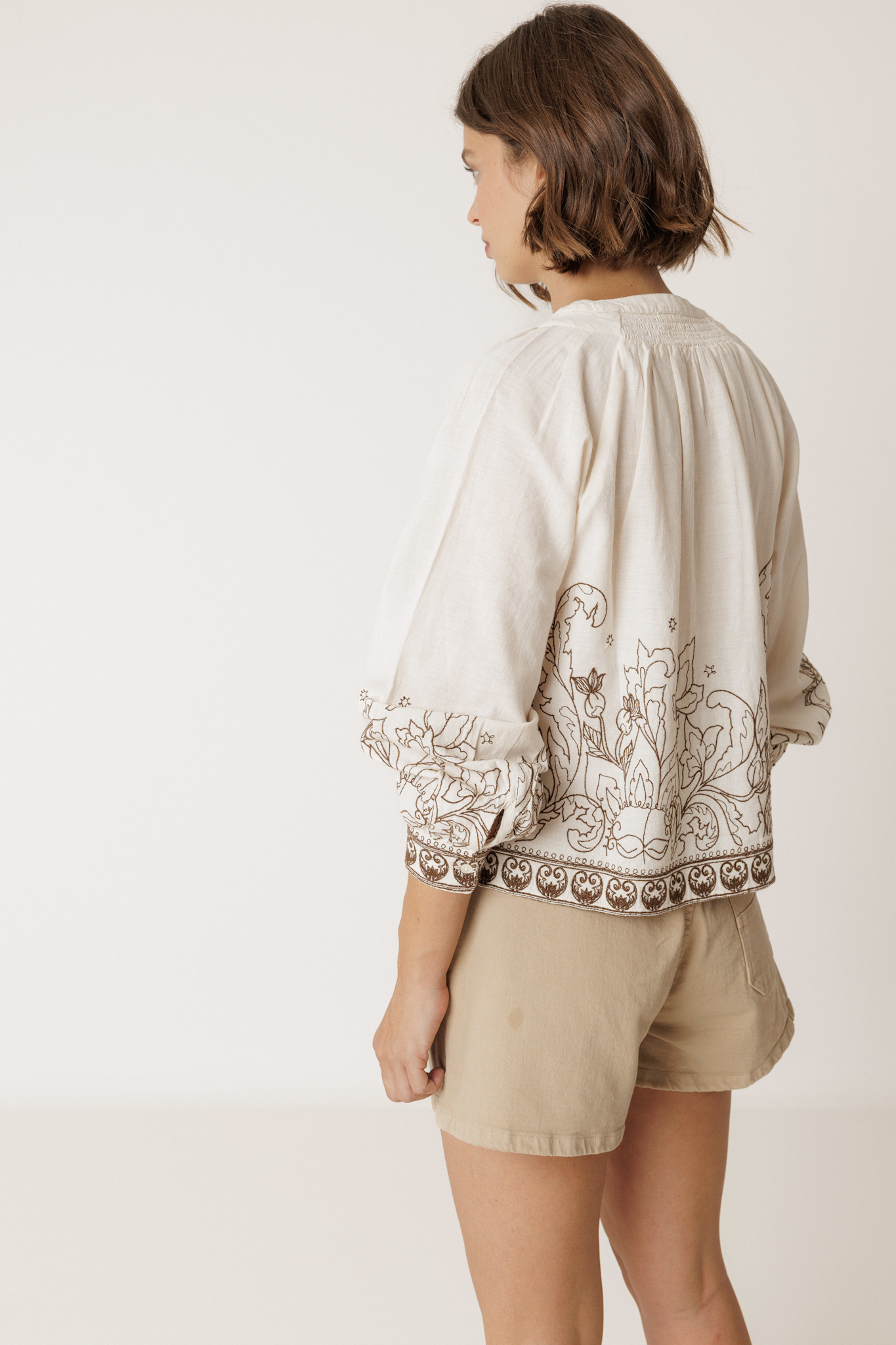 Blouse Indi & Cold à manches 3/4 crème à broderies vert khaki