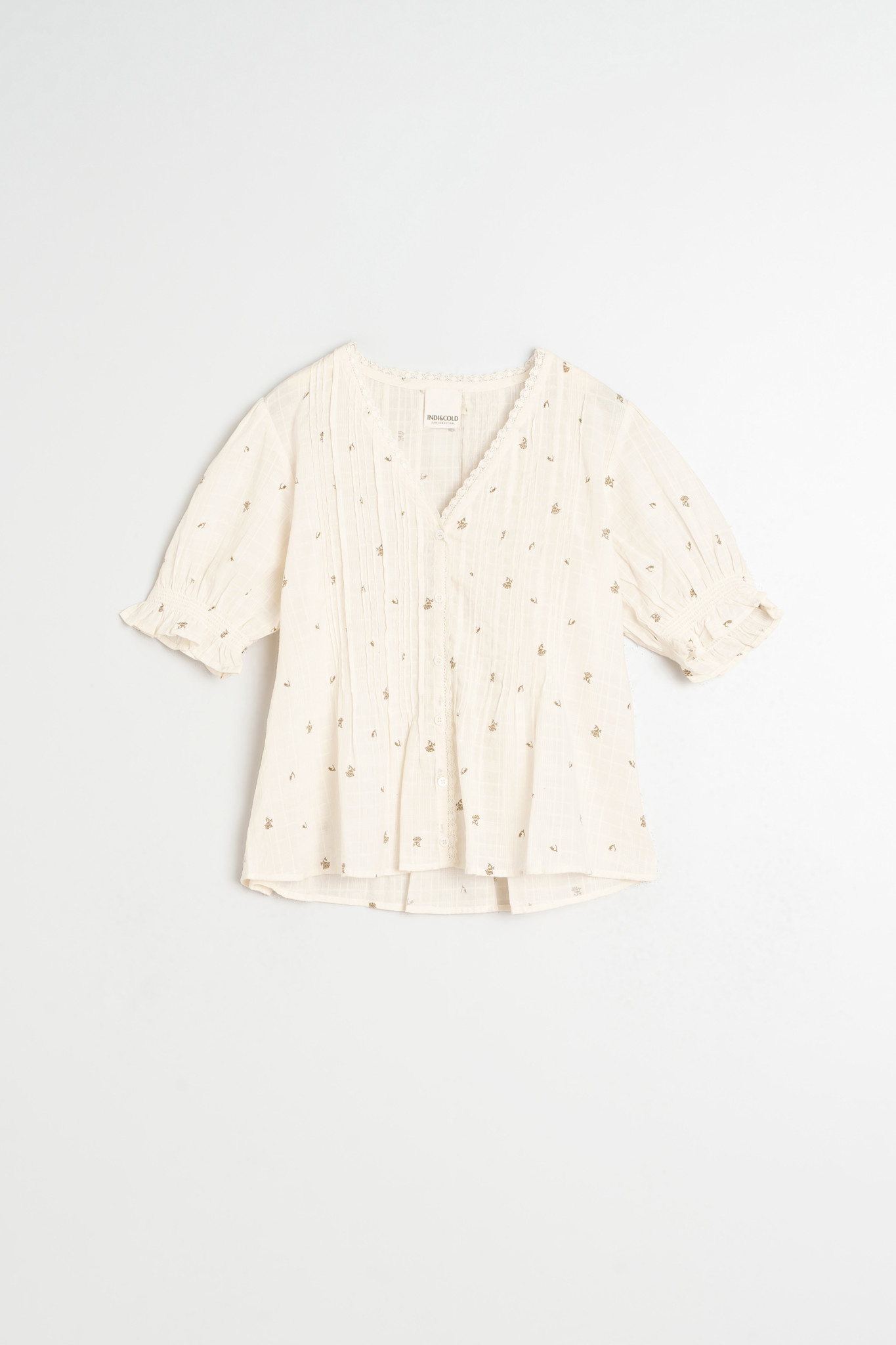 Blouse Indi & Cold à manches courtes & col V crème à broderies florales vert khaki