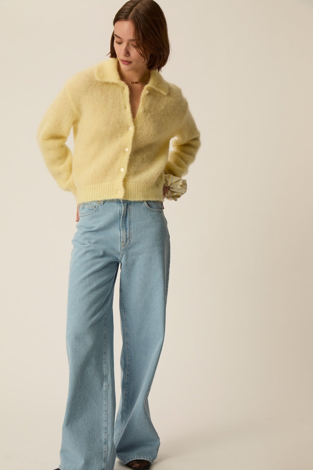 Cardigan Des Petits Hauts à col classique en mohair moelleux jaune beurre