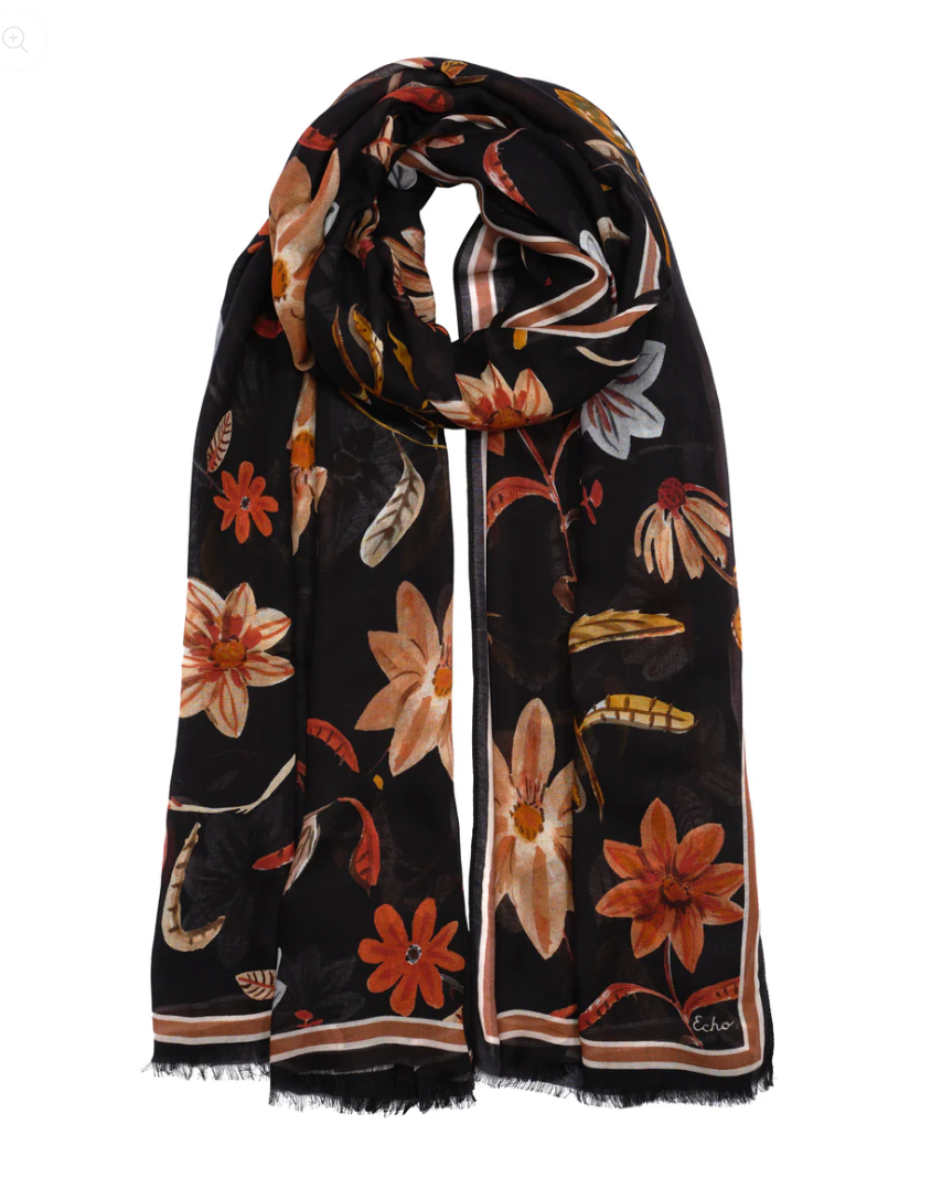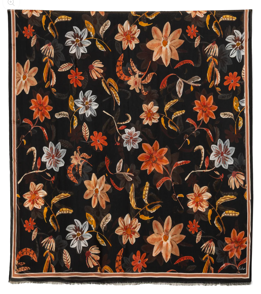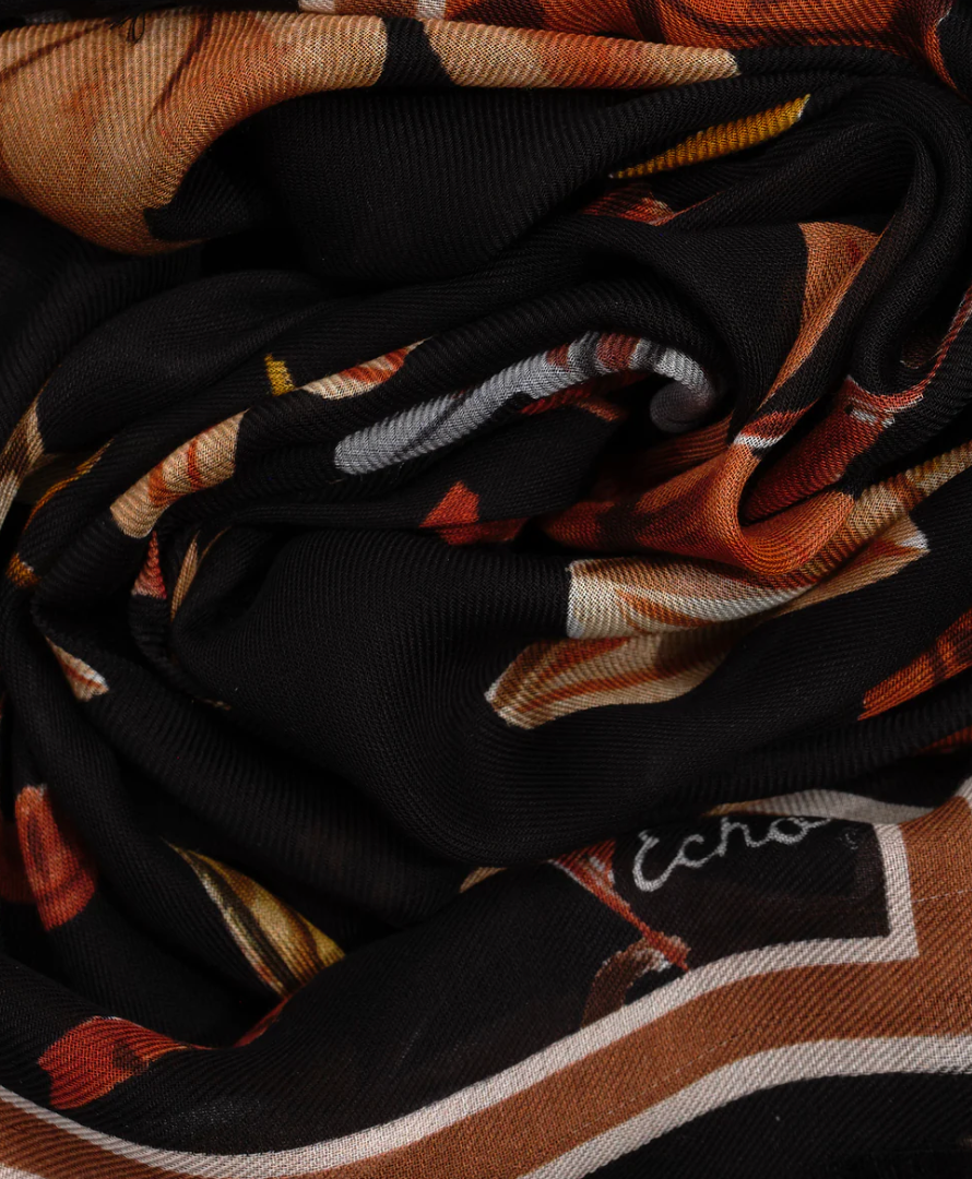 Foulard Echo noir fleuri orange brûlé