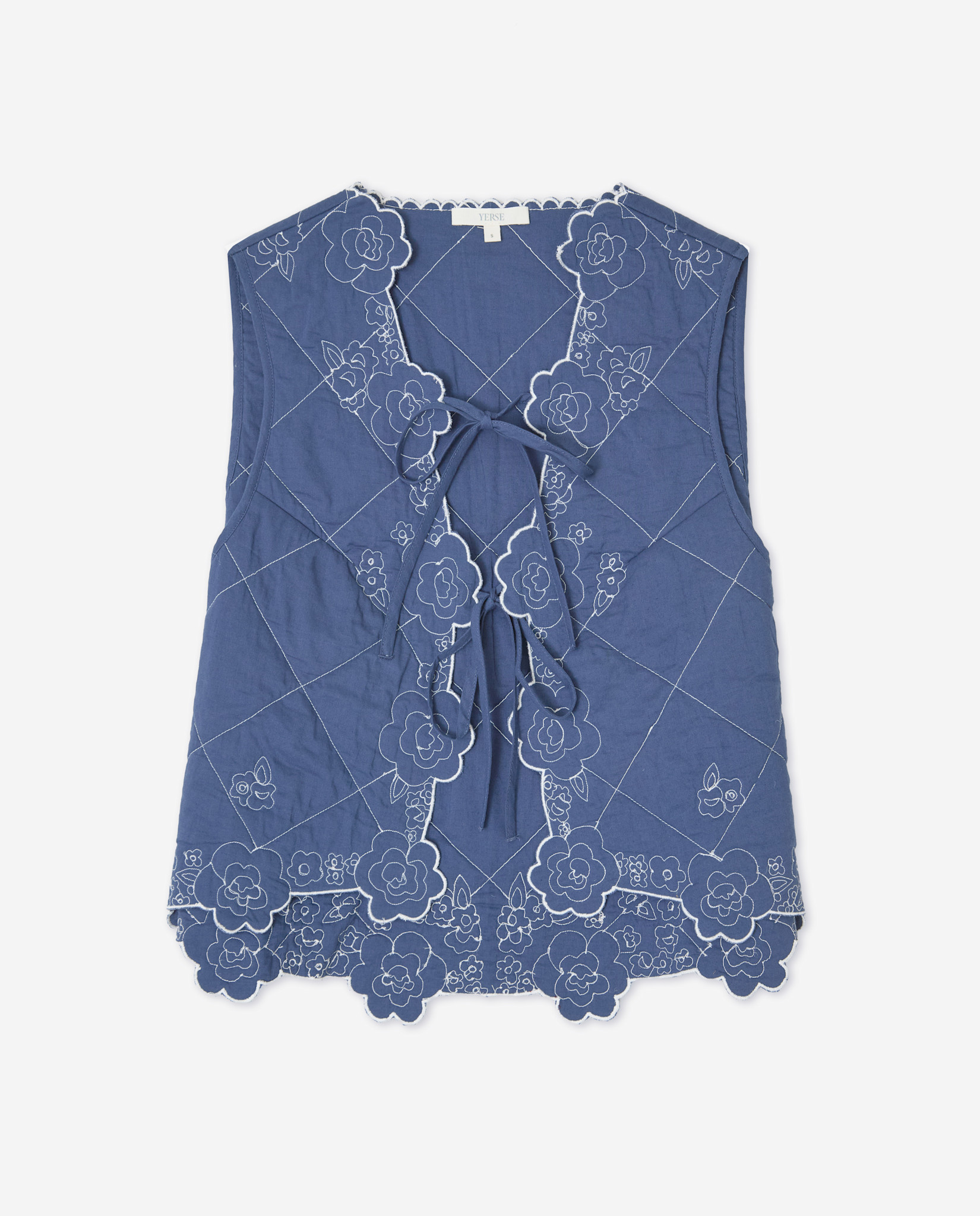 Description du produitCaractéristiques:Coupe régulièreCol VSans manchesLongueur courteMatelassé avec broderies contrastantes et bordures festonnéesSe noue à l'avantComposition:100% CotonRéférence de l'article:Style: 44898-056