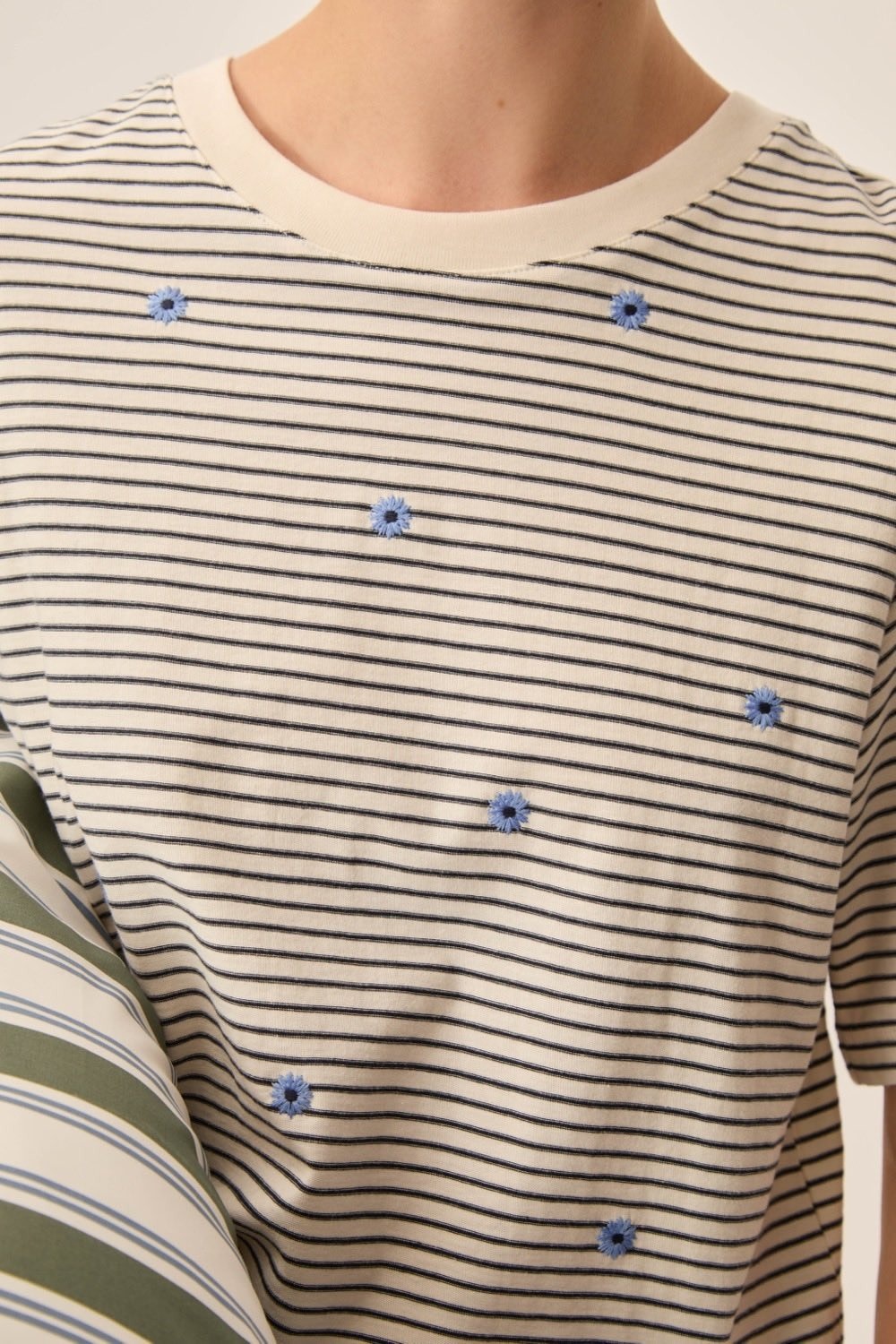 T-shirt Des Petits Hauts Josef rayé bleu marine & écru à fleurs bleues brodées