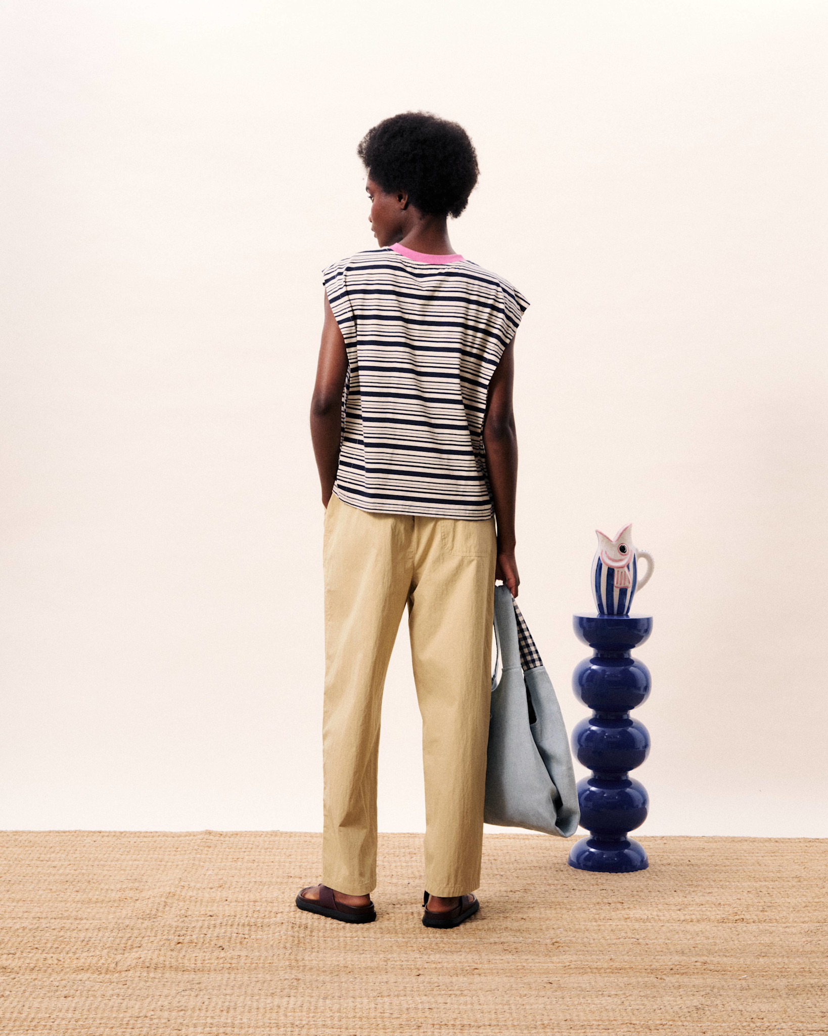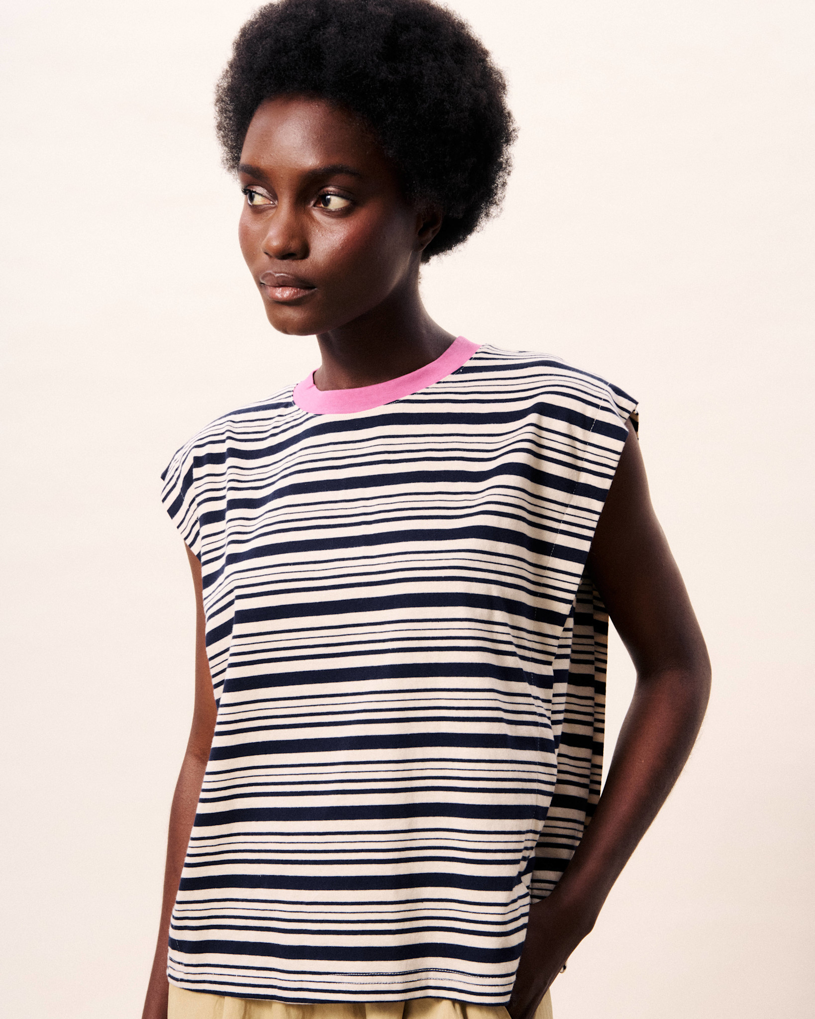 T-shirt Frnch Paris Siroka rayé bleu marine & crème avec bordure au cou rose violacé