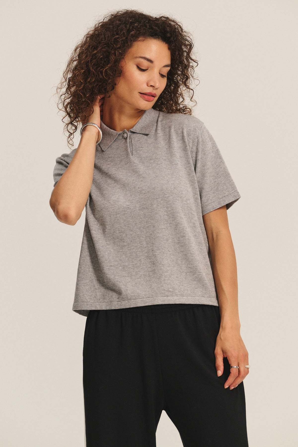 Description du produitCaractéristiques:Coupe relaxeCol poloÉpaules régulièresManches courtesLongueur régulièreBouton bijou au colComposition:95% Coton, 5% CachemireRéférence de l'article:Style: Emerson-Heather Grey